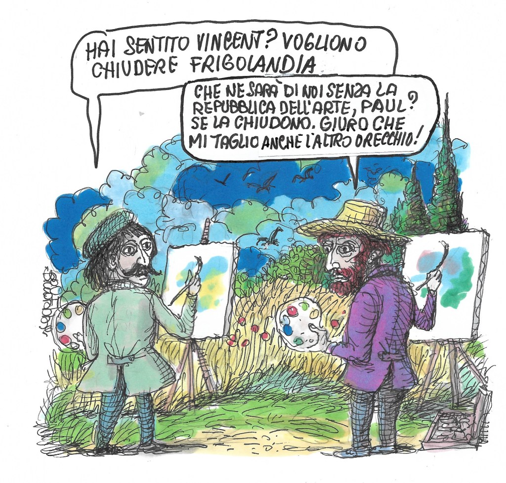 Nella Sala Conciliare del paese di Ninportadove, dove anche i gambi delle sedie erano avviluppati dalle onde beta, i responsabili della Kultura discutevano animosamente della futura “destinazione d’uso” di quel museo di “morto viluppo di memorie” e della sua conversione in luogo funzionale all’arte e allo spettacolo; riscuotendo l’entusiasmo di tutti i membri dei “partiti”, ad eccezion fatta del dottor Covid: assente giustificato, perché in vacanza sulle patrie spiagge.