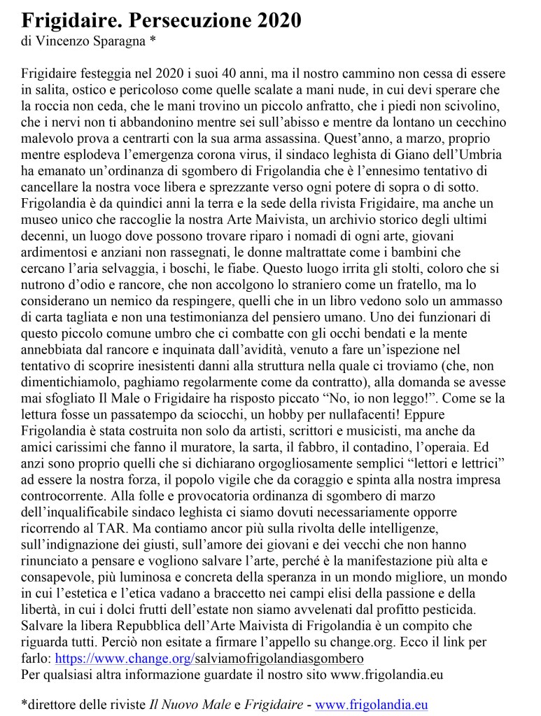 Chiudo le pagine di On the Road di Kerouac, e prima del tuo scritto sulla “mostruosa” e attuale situazione della Libera Repubblica di Frigolandia: vitale archivio della cultura sotterranea italiana, che in seguito a un ordinanza comunale deve sgombrare, e invitando tutti i lettori a firmare la petizione (firma qui) per evitare che ciò avvenga, mi concedo una favoletta consolatoria e alcune riflessioni.