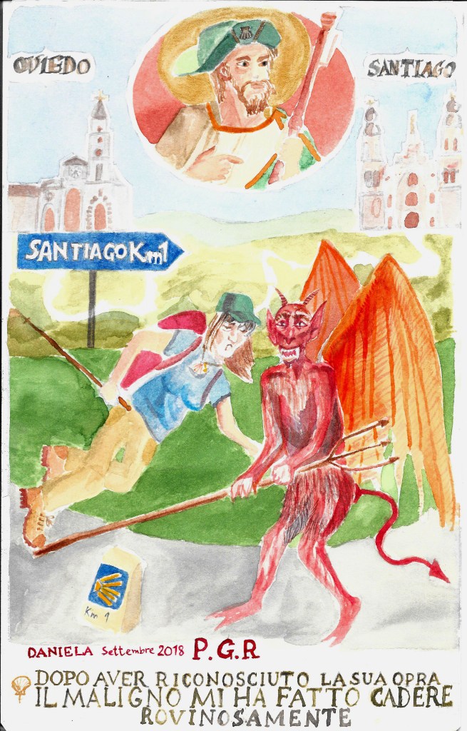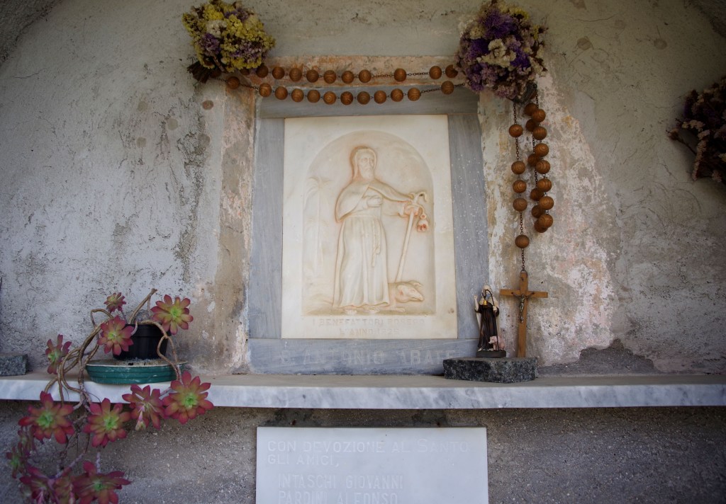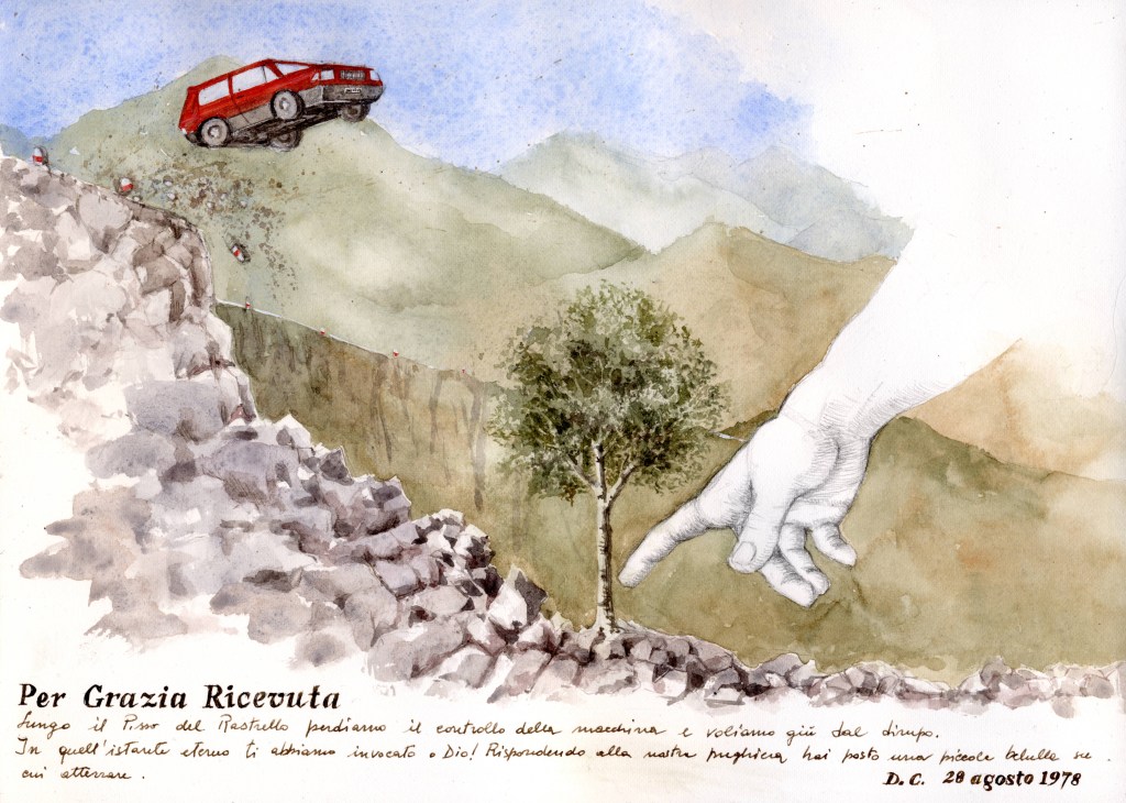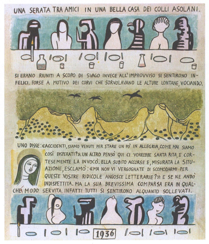 Sotto un cielo estivo, d’un chiaro freddo cobalto su di un invisibile nero, tre uomini seduti su una panchina contemplano il paesaggio – Guarda! È un paesaggio santo –Esclama un passante e se ne va, mentre il verde dei boschi e l’azzurro del cielo si fanno squillanti, e un leggero soffio vitale accarezza la montagna e ravviva il paese.